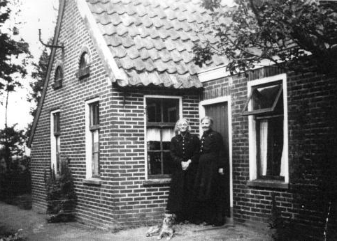 Rond 1949: voor het huis Liefke Klopstra en Jantje Holman